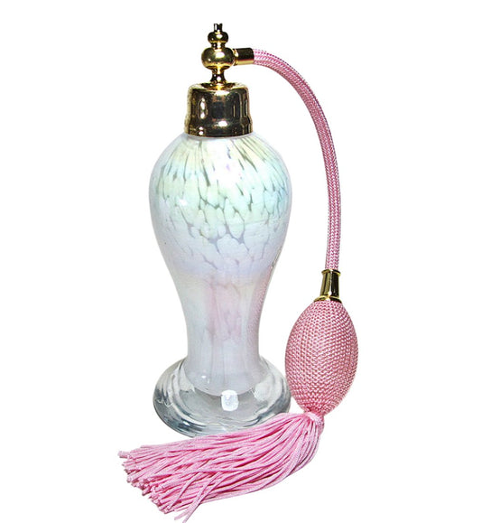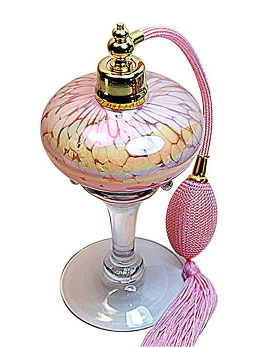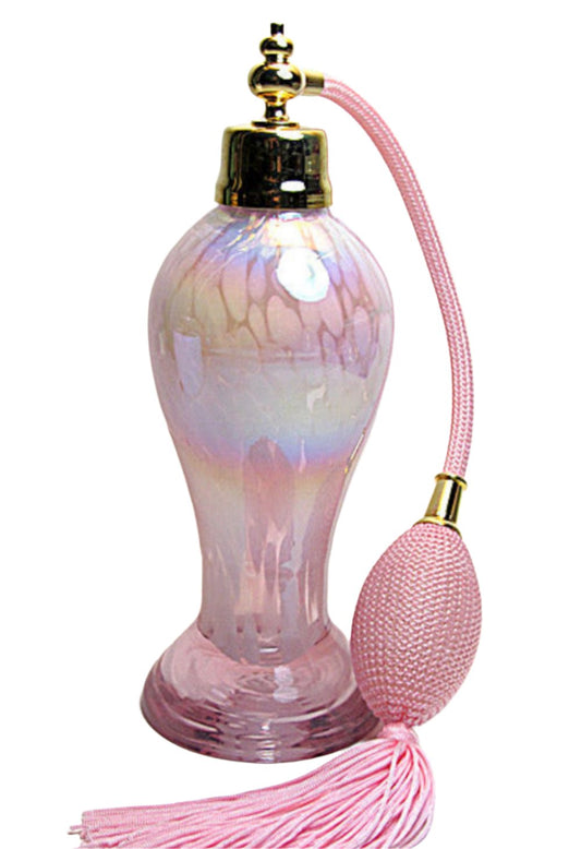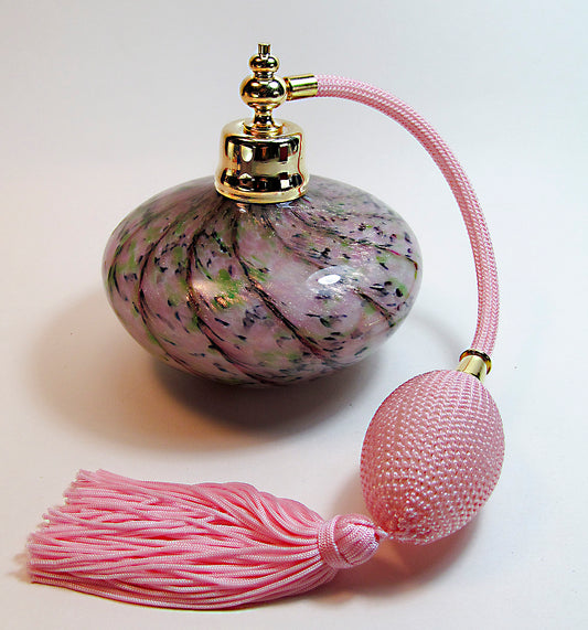 Art made with hand and mouth blew perfume bottle with pink bulb and tassel spray mounting.