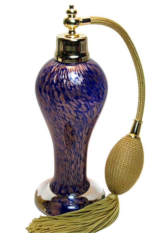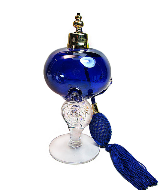 Art made by hand and mouth blow crystal glass perfume bottle with blue bulb and tassel spray attachment.