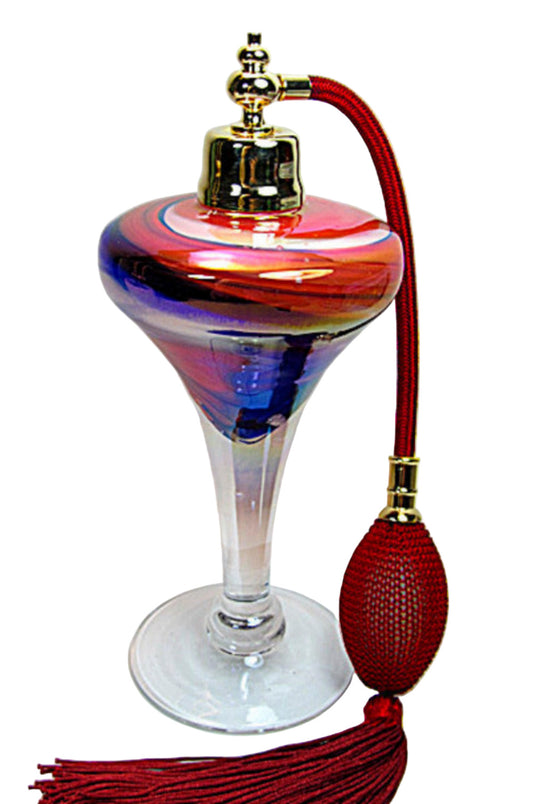 Mouth blew hand made art crystal glass perfume bottle with burgundy (wine) bulb and tassel spray attachment.