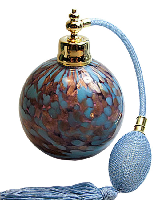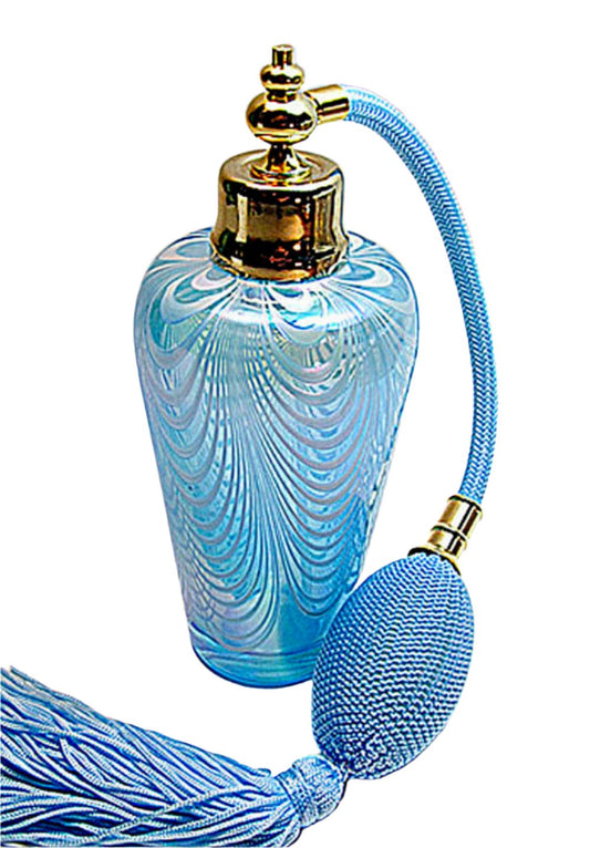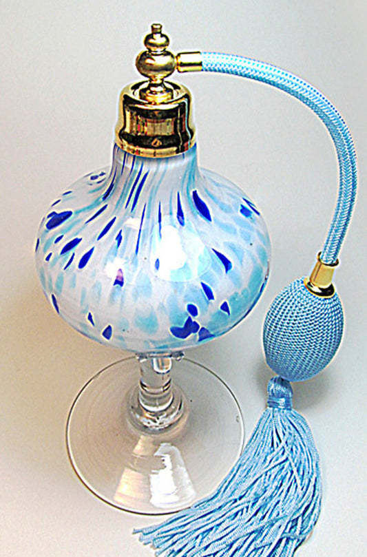 Art perfume bottle with cyan colour bulb and tassel spray mounting.
