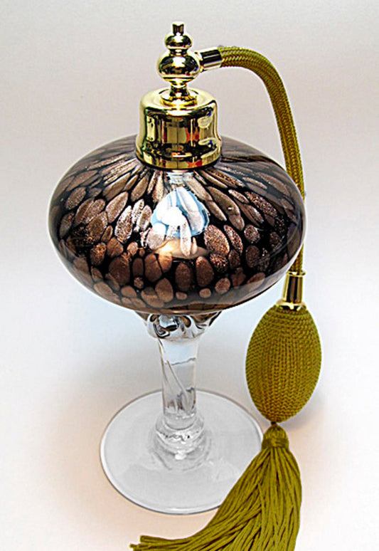 Hand made refillable perfume bottle with brown gold bulb and tassel spray mounting.