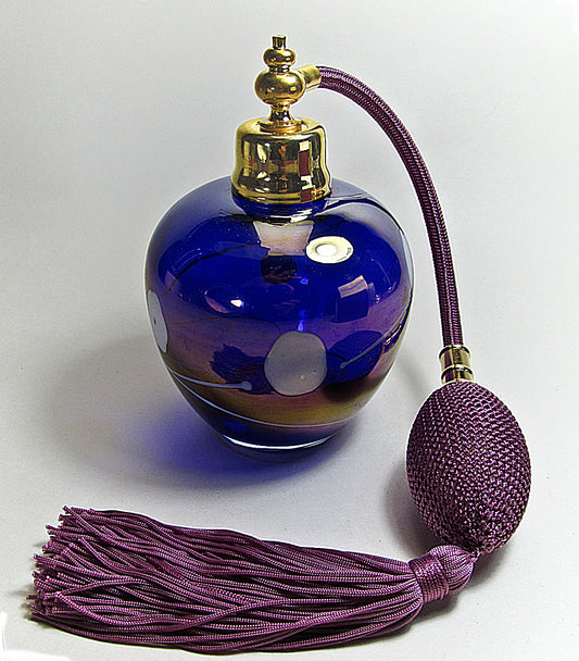 Excellent art crystal glass perfume bottle with dark blue bulb and tassel spray attachment.