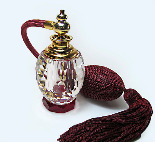Lead Crystal Perfume Atomizer Bottle With Sky Burgundy Squeeze Bulb And Tassel Spray Mounting.