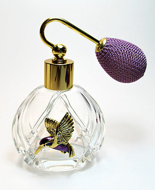 Unique vintage perfume spray bottle with purple bulb spray attachment.