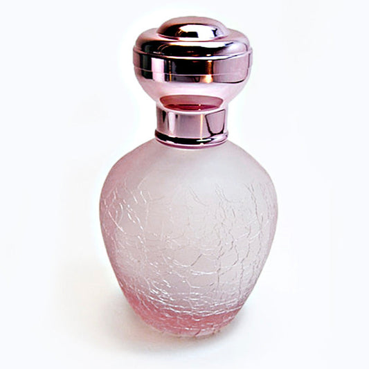 Pink Crackled Glass Perfume Bottle With Atomizer Spray Pump and Pink Metal Cap.
