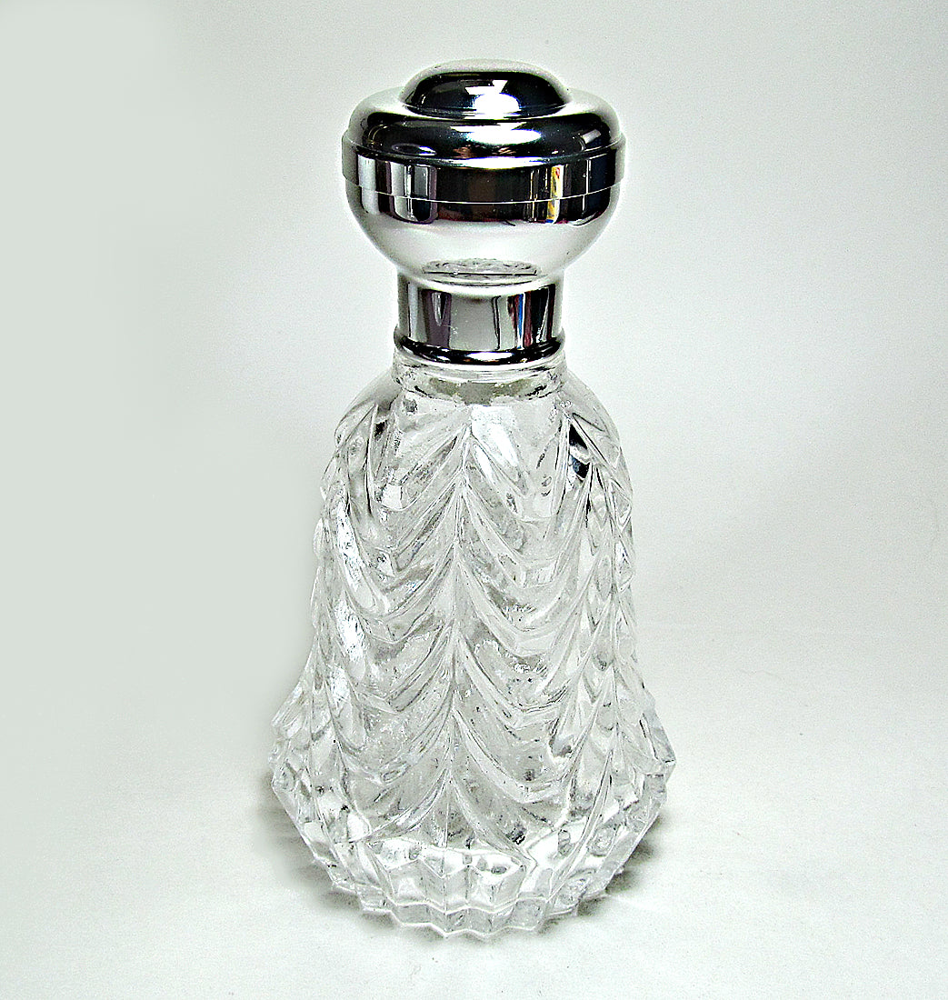 Finished: Crystal glass bottle in the carved design and fits with silver atomizer spray pump and cap.
