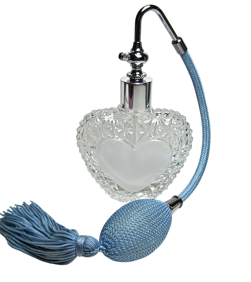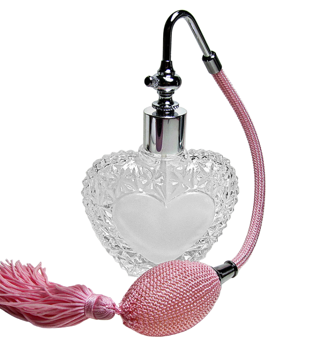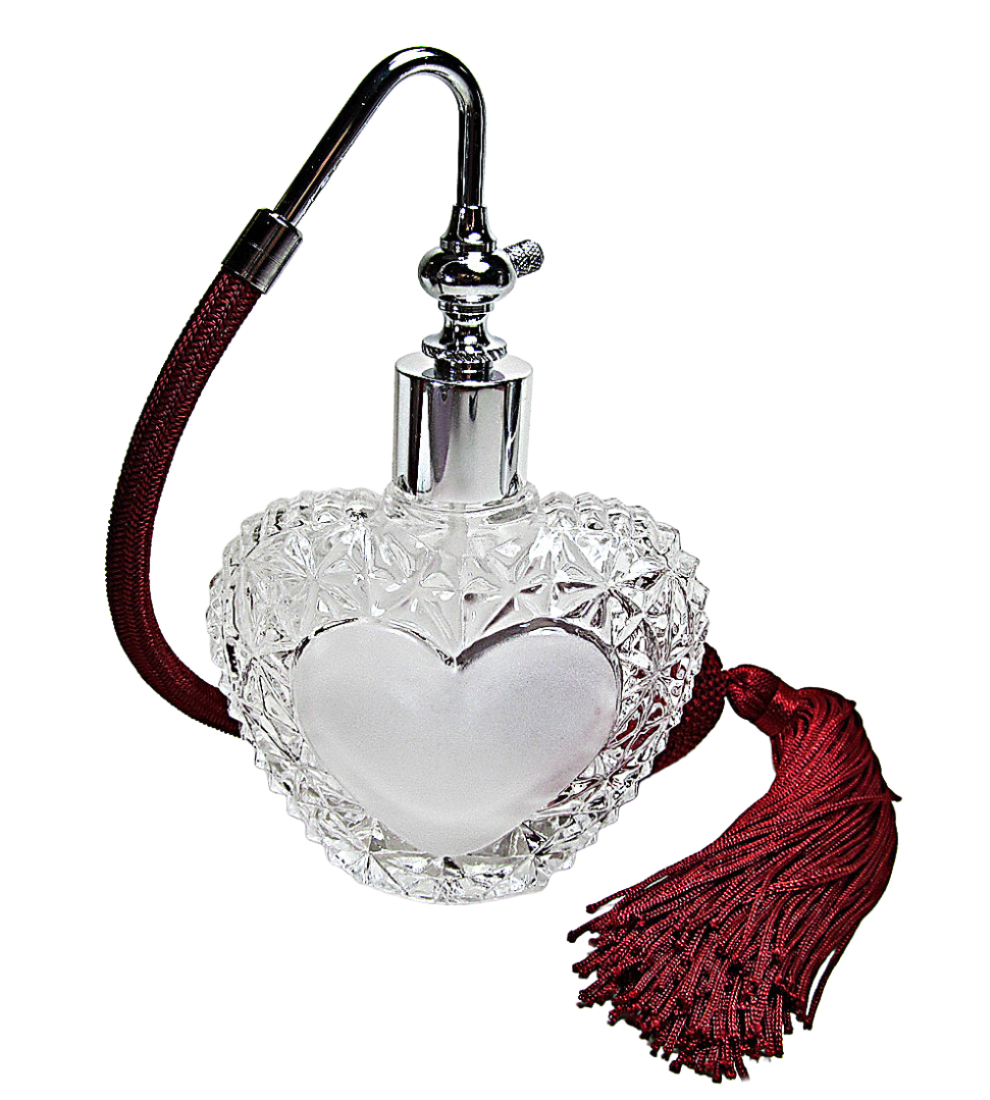 Finished: Heart-shaped crystal glass bottle with frosted heart decor. Fits with a Classic Nickel sprayer bulb and tassel spray mounting.